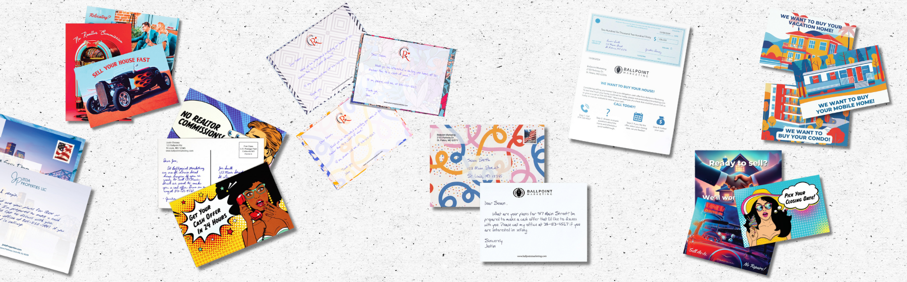 The original handwritten Ballpoint Marketing postcard theme that's still getting results! Seven different designs with matching message.