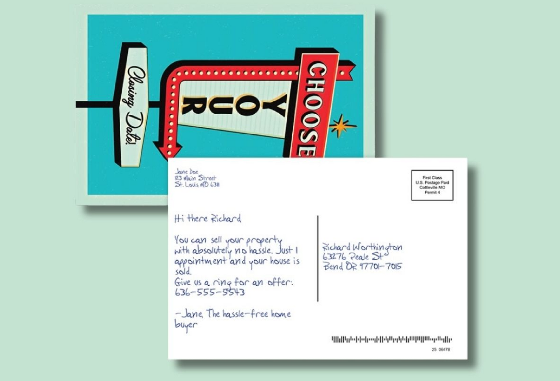 Some sellers want control without the hassle. This card gives them just that. With a vintage Vegas-style marquee and a punchy message about choosing their own closing date, it immediately stands out in the mailbox and delivers a sense of empowerment. This card is especially effective for sellers who are juggling moving timelines, probate cases, or want to line up another property before closing. It’s a friendly nudge that still gets the phone ringing. Interested in larger bulk orders or monthly discounts? Book a call with us