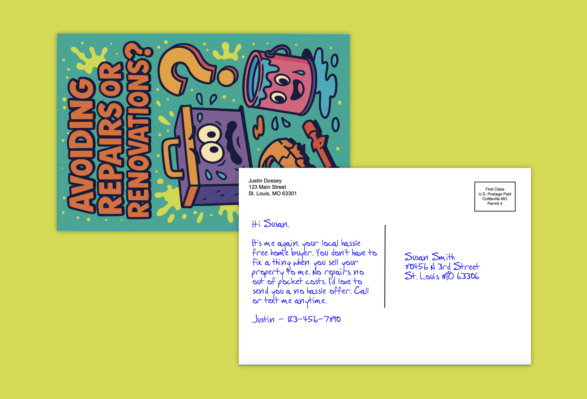 This 90s postcard uses bright, cartoon-style art to speak directly to homeowners who don’t want to deal with repairs or renovations. The fun design features paint cans and tools in chaos, while the message reassures them that they can sell as-is; no fixing, no stress, no out-of-pocket costs. The handwritten back copy reinforces trust and ease, showing sellers that you’ll take care of everything so they don’t have to lift a hammer.