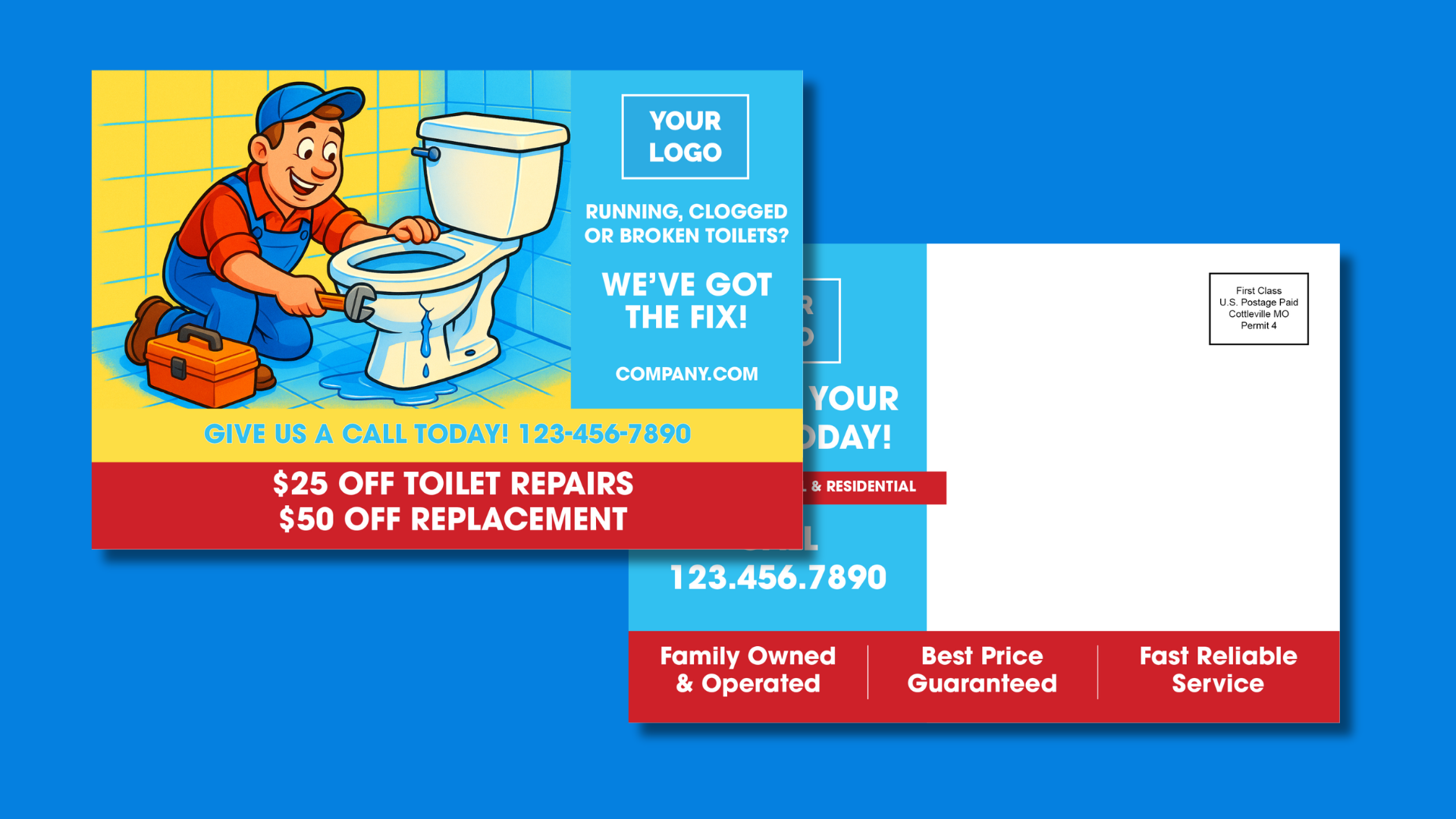 Few problems stress homeowners out more than a broken or clogged toilet. This postcard hits that frustration head-on with bold comic-style artwork and a clear promise: your company has the fix. The bright design grabs attention in the mailbox, and the simple message makes it easy for homeowners to act fast. For plumbing companies, itโs a proven way to generate urgent calls and steady business from everyday household problems.ย Interested in larger bulk orders or monthly discounts? Book a call with us