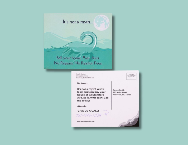 The legendary sea creature makes an appearance, this time as your lead generator. With soft aqua tones and a slight humor message, this card is great for sellers who might think your offer sounds too good to be true. Use it when you want to hammer home the “fast, as-is, no fees” pitch while keeping things light and fun. Interested in larger bulk orders or monthly discounts? Book a call with us