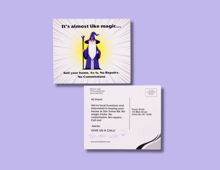 No repairs. No commissions. No headaches. This postcard cuts adds some fun to your as-is, no-repair pitch, using a friendly cartoon wizard to disarm skepticism. With its bright background and simple pitch, this card works great for sellers, DIY types, or anyone who just wants a clean, fast offer without all the “agent stuff.” Interested in larger bulk orders or monthly discounts? Book a call with us